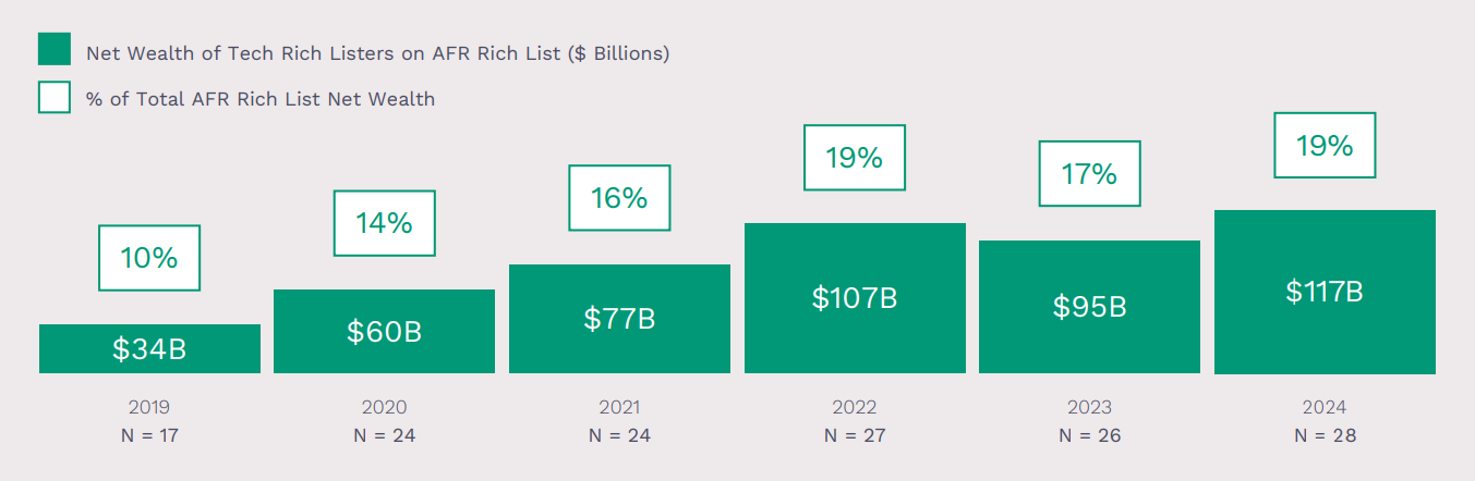 Australia is home to 20,000 tech startups, a number that continues to grow. In 2022, 21 reached “unicorn” status, valued at over US$1 billion. By 2024, 28 tech entrepreneurs featured on the Australian Financial Review Rich List, holding $116.7 billion - 19% of total wealth, nearly double 2019’s 10%. Among Australia’s Young Rich, 31 of the top 100 under-40s made their fortunes in tech, including eight of the top ten.